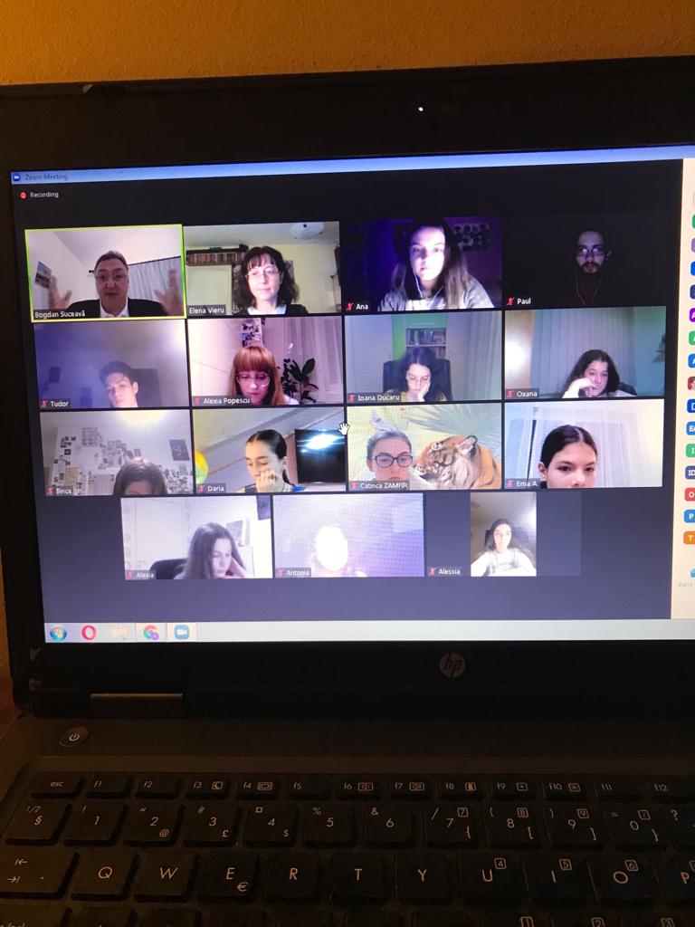 Întâlnirea s-a desfășurat pe platforma zoom, într-o atmosferă caldă și prietenoasă, dezbătându-se atât subiecte legate de literatură, punctul de plecare fiind romanul Avalon. Secretele emiganților fericiți (Polirom, 2018), cât și problemele actuale ale adolescenților, vizând devenirea lor, în contextul globalozării pe care o traversăm. Activitatea cu studenții a profesorului Bogdan Suceavă și-a spus realmente cuvântul, dumnealui oferindu-le elevilor răspunsuri nuanțate, pline de substanță. „A fost o experiență minunată și un om de la care avem întotdeauna ceva de învățat. Povestea sa de viață poate constitui cu adevărat un model pentru orice tânăr dornic să-și depășească limitele.” (Ana Ioniță – clasa a X-a)